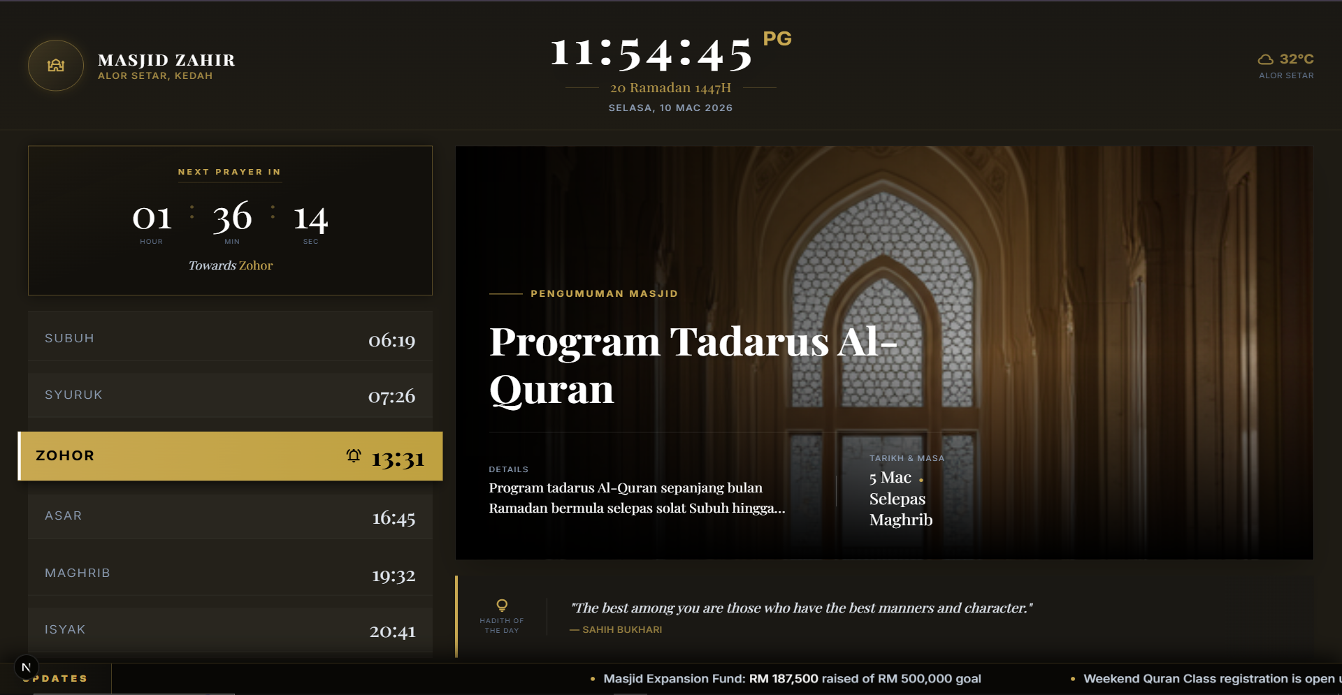 Zahir Digital adalah sebuah platform pengurusan masjid moden yang direka khas untuk Masjid Zahir, Alor Setar. Sistem ini mengintegrasikan portal awam, panel pentadbiran (admin), dan paparan smart TV untuk pendigitalan pengurusan masjid secara menyeluruh.