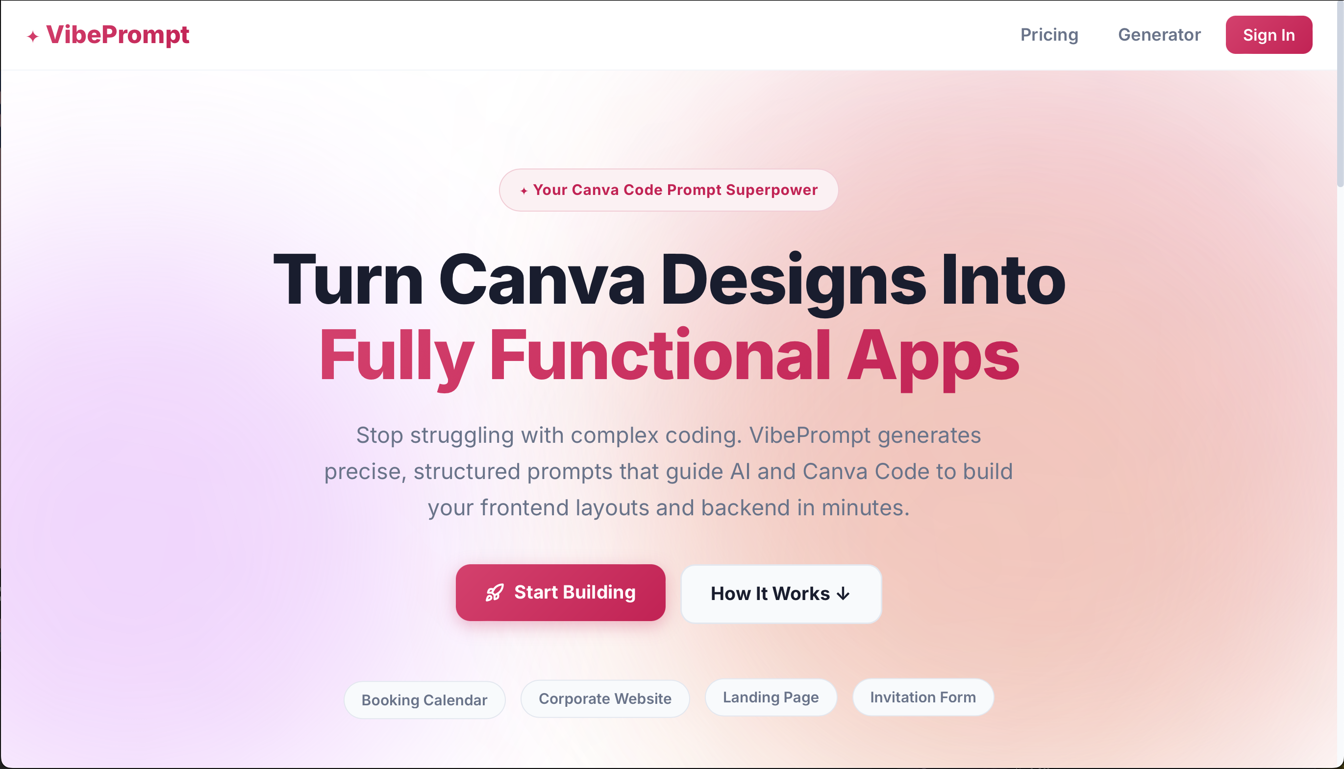 Stop struggling with complex coding. VibePrompt generates precise, structured prompts that guide AI and Canva Code to build your frontend layouts and backend in minutes.