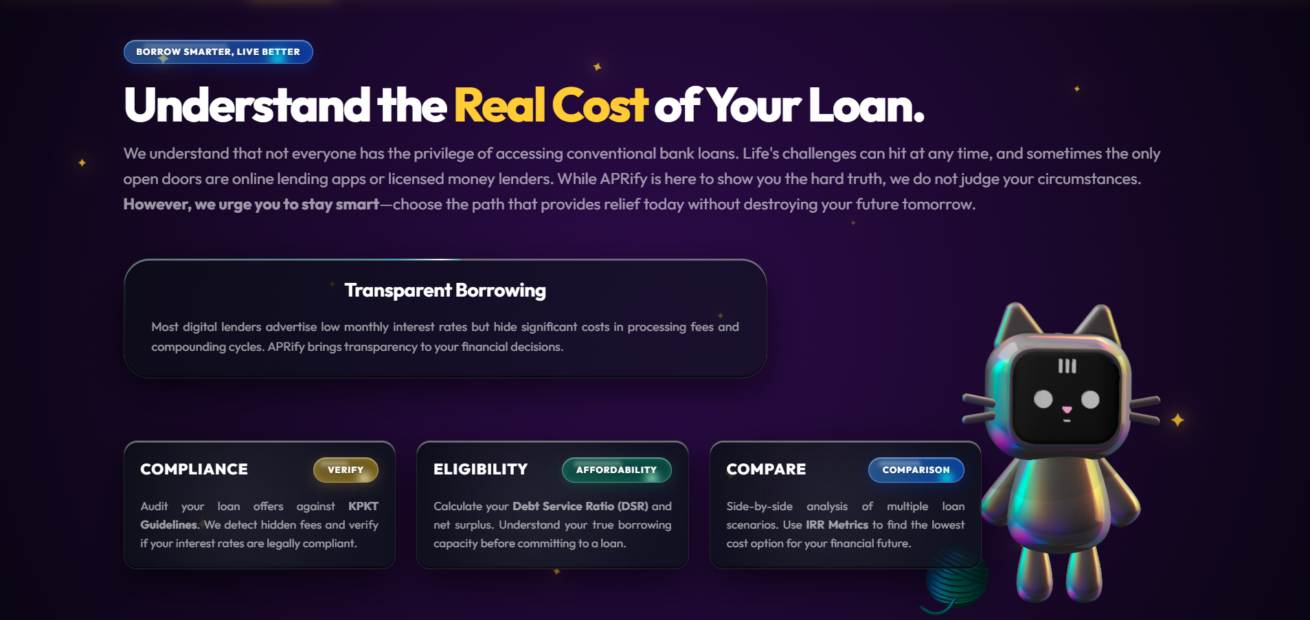 APRify is a fintech web application designed to help users understand the true cost of loans by uncovering hidden fees, analyzing affordability, and comparing financing options—empowering smarter and more transparent borrowing decisions.
